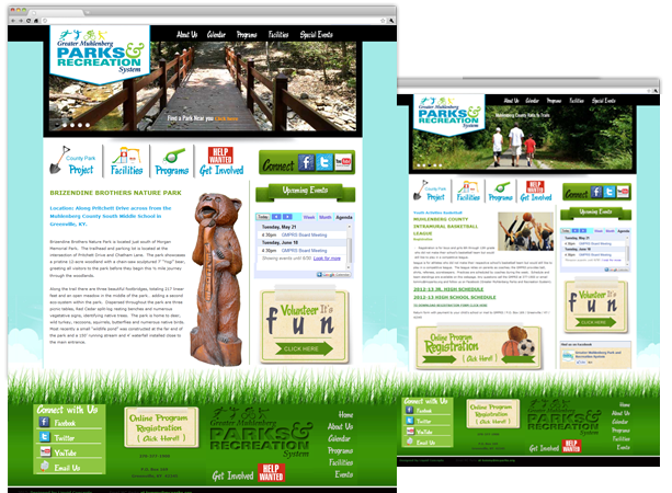 Muhlenberg County Parks needed a new webiste that showcased a fun, kid friendly design. They wanted to connect to their online registration system, allow for a Google Calendar feed and make social networking prominent. The resulting design encompassed all that and a Content Management System that allowed park employees to update the site at their convenience.